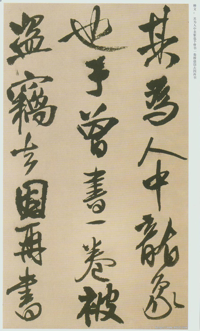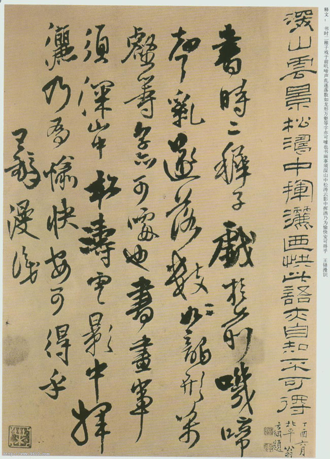 书时,二稚子戏於前,叽啼声乱,遂落数“..”,如“龙形万壑”等字,亦可噱也。书画事须深山中、松涛云影中挥洒,乃为愉快,安可得乎? 王铎漫识。