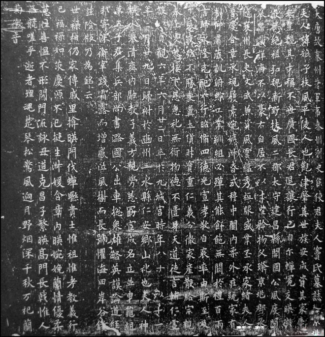大唐故泰州诸军事泰州刺史侯使君夫人 窦氏墓志夫人讳 娘子扶风平陵 人也观津肇其世族安成资其家庆 安丰魏其才称不世广国长 君退让行己自尔蝉冕交映徽猷无绝 祖 弘魏新野扶风 二郡太守建昌县 开国公风度闲举气识详济不以豪右自居不以财望矜物父 璨 京兆郡丞 隋 - 襄州 长史文武兼资风云蕴秀祗服盛业丕承家绪夫人育庆含章承规履素婉嫕淑慎式穆中闺 内柔外庄 统家有制 仰素箴训俯综工业紃组必殚其能饘饐无阙于礼百两言归 永隆克配 六行昭备四德光宣孝敬自衷率由斯至及丁哀疚殆不胜丧粪土货财宝重仁义分彻家产散给宗亲奉上虔恭接下慈惠礼无愆物德不匮身天道徒言辅仁虚设 以 贞观 六年六月廿二日卒于 九城宫 时年八十 以 十一年二月廿九日 归祔于 豳州 - 三水县 - 仁安乡 山礼也夫人神机外举清爽内融教子义方 亲劳慈勖宦成名立并曳龟组第五子 君集兵部尚书潞国公 出车总众雄略英谟论道经邦寄深衡宰践霜露而增感泣风树而长号惧海田岸谷镂兹阴版乃为铭云世禄相仍家传戚里揜映门伐 蝉联贵士惟祖惟考教义行己福禄如茨庆源不已挺生淑媛含章内映婉娩兰情优柔 葸 性喜愠不形闱门流咏母道克昌子(孙) 繁映高门长戟惟人无竞嗟乎逝者埋魂楚琴 松惊风迥月野烟深 千秋万祀兰菊徽音。