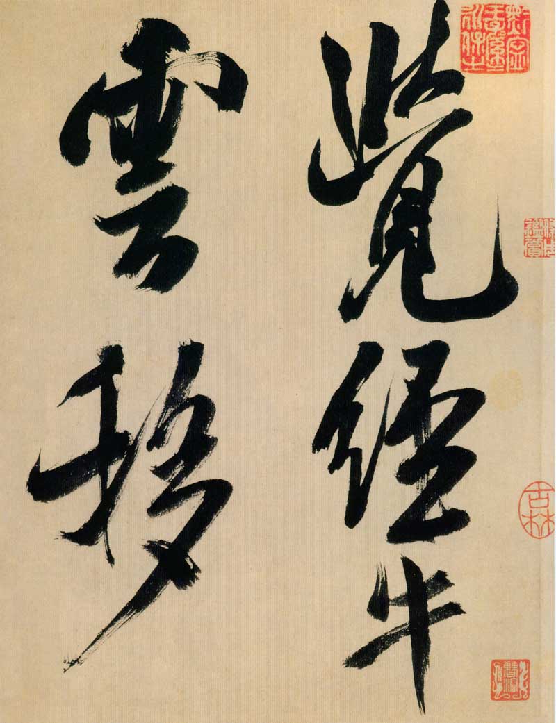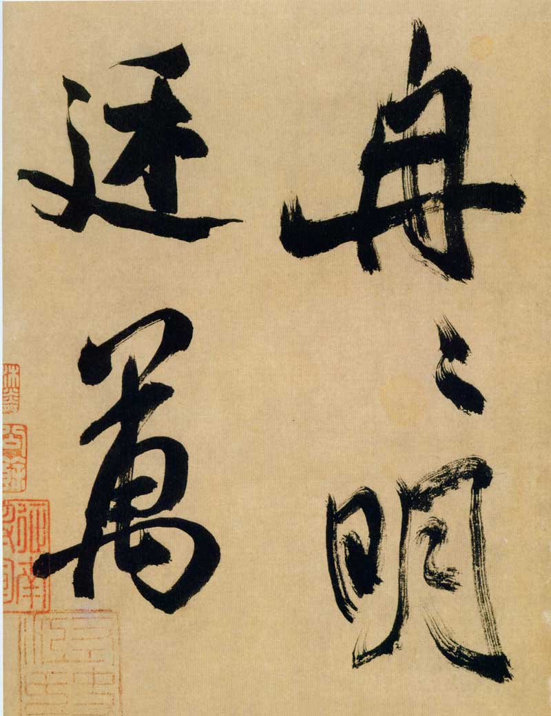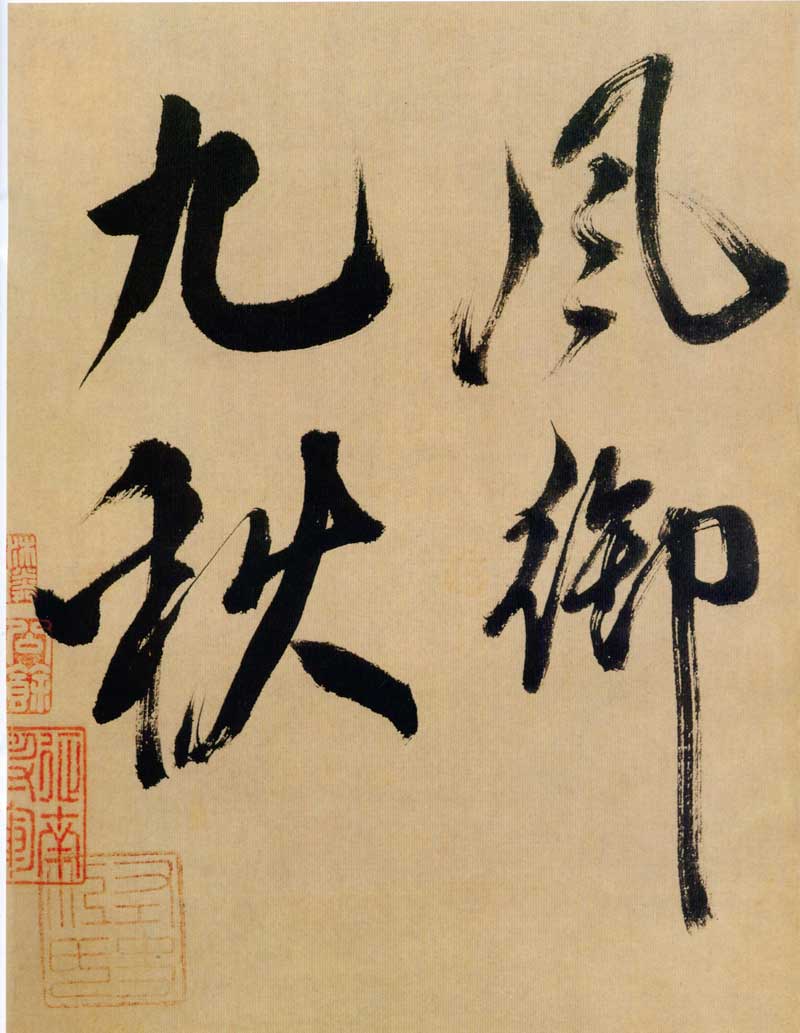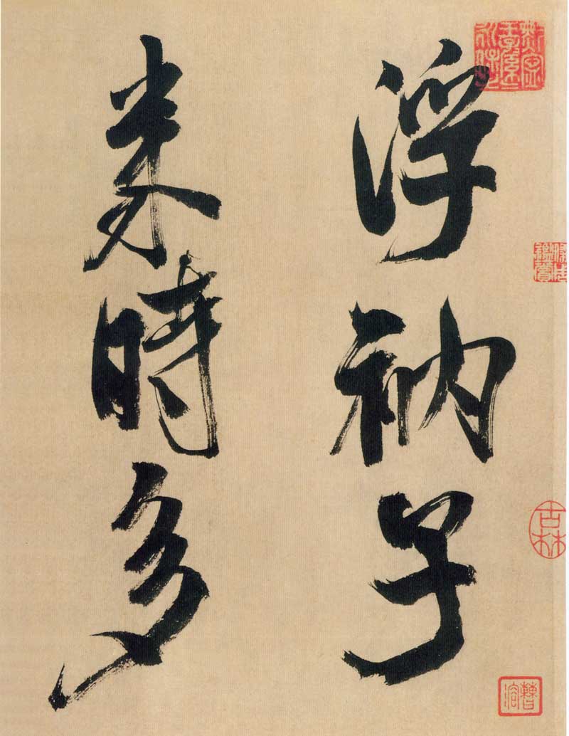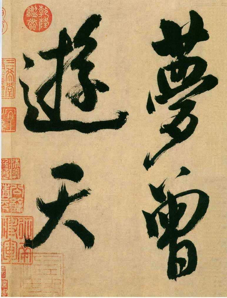 《多景楼诗册》是米芾晚期大字作品,与他30来岁时创作的《吴江舟中诗》比较,明显用笔老辣、厚重,间架欹侧中见稳健,极为豪放,笔力雄伟。面对《多景楼诗册》,可以想象出米芾挥毫时“神游八极,眼空四海”的气魄。他自称“刷字”的运笔方式在此册中表现得极为明显,许多笔画的起笔呈现散开的锋毫。一些竖笔、撇笔因运行急速而留出飞白。整幅作品气势豪迈,跌宕的笔画间蕴涵着巨大的张力。
