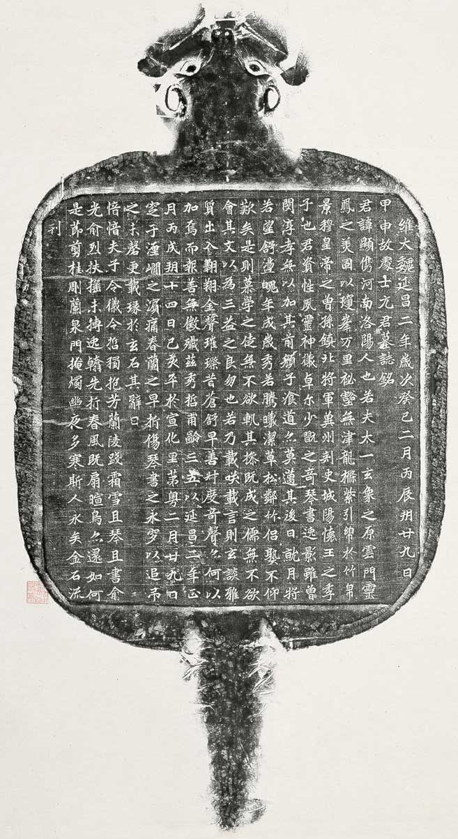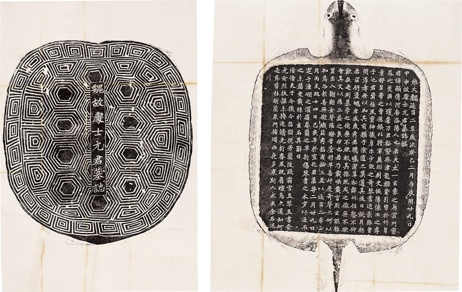 《元显俊墓志》此志石灰石质,通高35厘米,长75厘米,宽56.5厘米。上面为志盖,用阴线刻满四边形、五边形、六边形的龟甲纹样,龟甲中央阴刻正书“魏故处士元君墓志”八个字。下面镌刻着正书志文,计十九行,行二十一字,共三百五十七字。志盖和志文上下相合,正好为一个生动、完整的石龟,而且龟的首尾、四足毕具。把墓志制成象征长寿的龟形,祈求墓主在九泉之下得其永年。这一形制,在北魏墓志中为仅见,后世也极少出现。