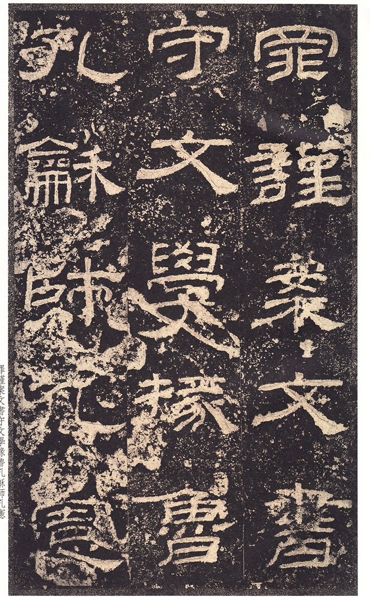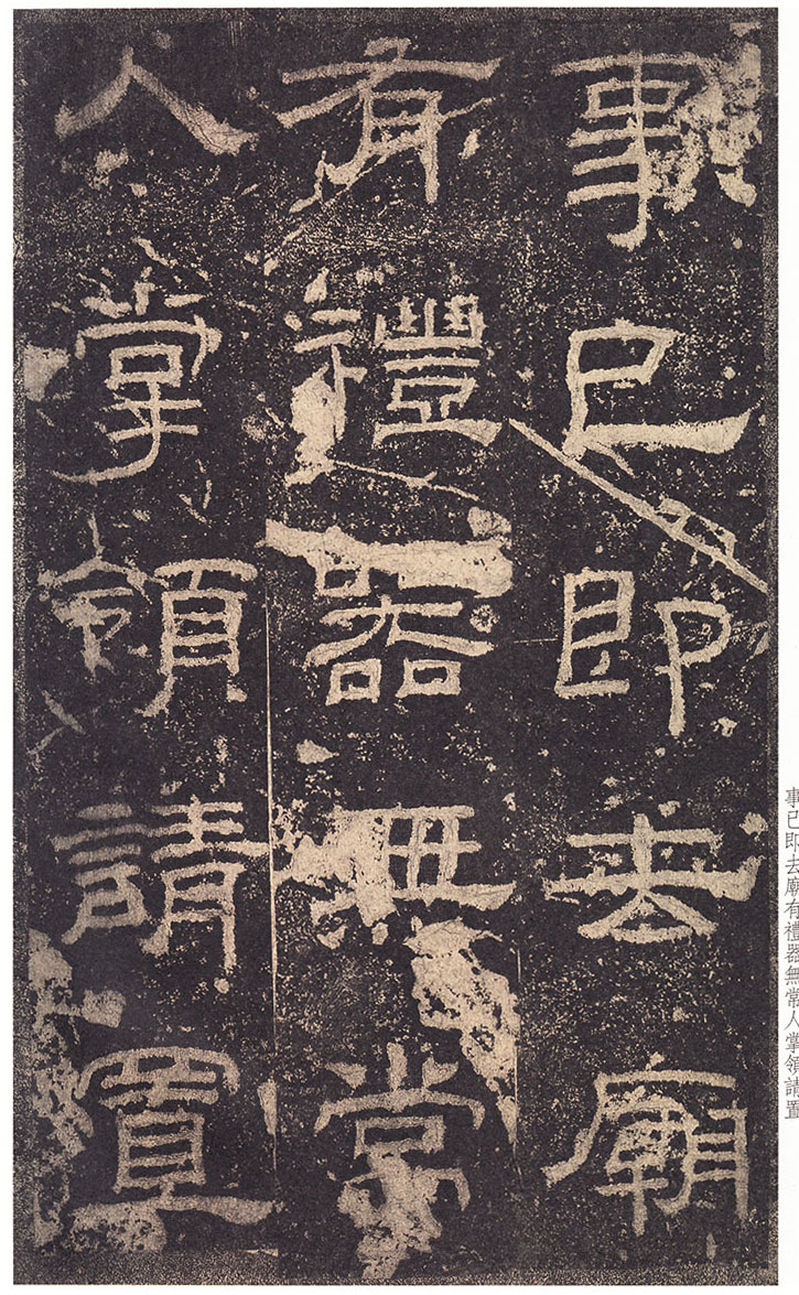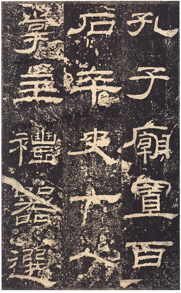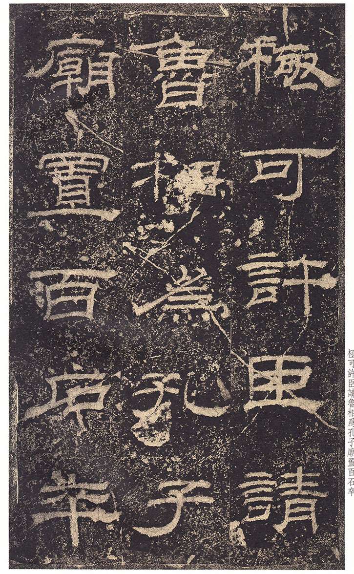 司徒臣雄,司空臣戒,稽首言,魯前相瑛書言,詔書崇聖道,勉□〔藝〕,孔子作春秋,制孝經,□□五經,演易〔繫〕辭,經緯天地,幽讚神明,故特立廟,成四時來祠,事已即去,廟有禮器,無常人掌領,請置百石□□一人,典主守廟,春秋饗禮,財出王家錢,給犬酒直,須報,謹問大常,祠曹掾馮牟,史郭玄辭對,〔故事辟〕□〔禮〕未行,祠先聖師,侍祠者,孔子子孫,大宰,大祝令各一人,皆備爵,大常丞監祠,河南尹〔給〕牛〔羊〕彖□□□各一,大司農給米祠,臣愚以為,如瑛言,孔子大聖,則象乾,為漢制作,先世所尊,祠用眾〔牲〕,長□〔備〕□,〔今欲〕加寵子孫,〔敬〕恭明祀,傳於罔極,可許,臣請魯〔相〕為孔子廟置百石卒史一人,掌領禮器,〔出〕□□□,□〔犬〕酒直,他如故事,臣雄、臣戒、愚戇惶恐,頓〔首〕頓首,死罪死罪,臣稽首以聞。 制曰可, 〔司徒公〕河〔南〕□□□□〔字〕季高元嘉三年三月廿七日壬寅奏雒陽宮 司〔空公〕蜀〔郡成都〕□〔戒〕字意伯 元嘉三年三月丙子朔,廿七日壬〔寅〕,司徒雄,司空戒下魯相,承書〔從〕事,下當用者,〔選其年〕〔以〕□,經通一藝,雜試通利能奉弘先聖之禮,為〔宗〕所〔歸〕者,如詔書,書到言:永興元年六月甲辰朔十八日辛酉,魯相平,行長史事,守長〔擅〕,叩〔頭〕死罪,〔敢〕言之,司徒司空府壬寅詔書,為孔子廟置百石卒史一人,掌主禮器,選年以上,〔經〕通〔一〕藝,〔雜試能〕奉弘先聖之禮,為宗所歸者,平叩頭叩頭,死罪死罪,謹案文書,守文學掾魯孔龢,師〔孔〕憲,戶〔曹史孔寬等〕雜試,龢脩春秋嚴氏,經通高第,事親至孝,能奉先聖〔之〕禮,為宗所歸,除龢,〔補〕名狀如〔牒〕,平〔惶恐叩頭,死〕罪死罪,上司空府 讚曰:巍巍大聖,赫赫彌章,相乙瑛字少卿,平原高唐人,令鮑疊字文公,上黨〔屯〕留人,政教稽古,若重規〔矩〕,乙君察舉,守宅除吏,孔子十九世〔孫麟〕,廉請置百石卒史一人, 鮑君造作百石吏舍,功垂無窮,於是始□。