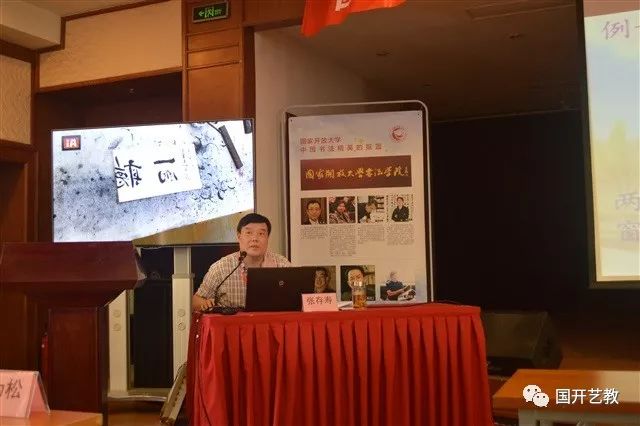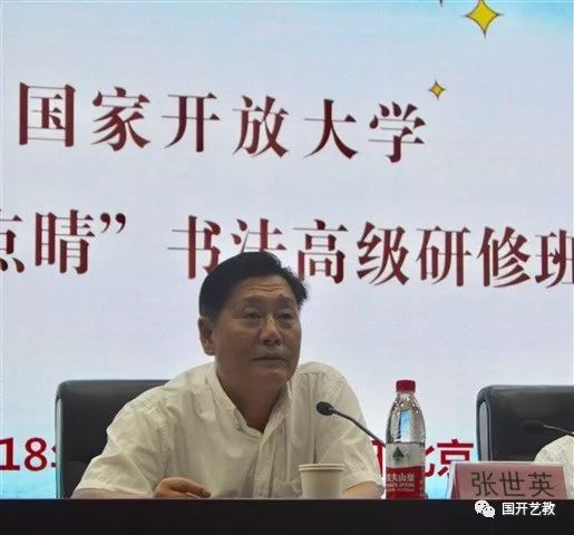 在开学典礼上,张世英副书记热情洋溢地发表讲话。他对国家开放大学在建设发展、办学规模、培养人才,特别是在开展“互联网+教育”上取得重大成就表示祝贺,对国家开放大学的书法教育和书法学院工作给予充分肯定。他说:“蔡民基院长是一位文武军人,有深厚的文化底蕴和丰硕的军事理论研究成果,近些年投身于书法教育的探索创新,带头推广普及书法教育,特别是带领团队组织举办‘书苑点睛’高研班,创建‘中国书法教育村工程’‘助残创业工程’,积极探索‘名师扶星’工程,具有前瞻性、创新性、引领性和示范性,完全符合党的十九大战略部署。”他认为,国家开放大学“书苑点睛”书法高研班,名家师资多,教学方法活,研修效果好,社会影响大。