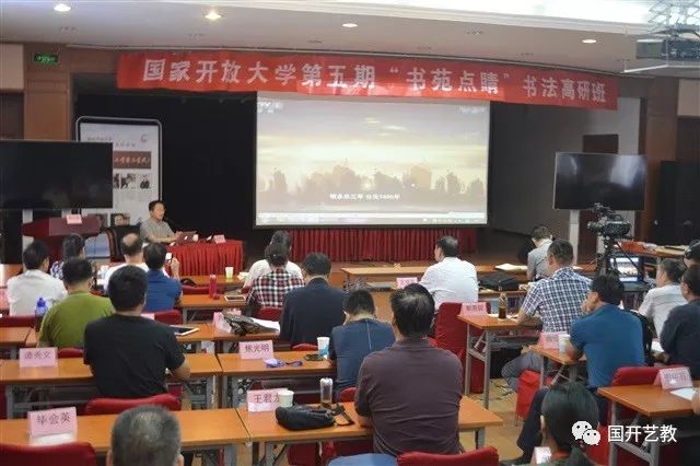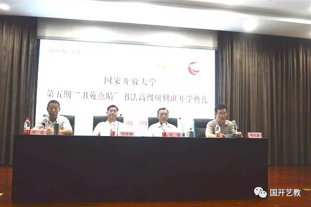 “风光不与四时同”。仲夏的北京,明净的蓝天、炽烈的阳光,正酝酿着一场甘霖。2018年6月23日上午,国家开放大学第五期“书苑点睛”书法高级研修班开学典礼在该大学总部会议厅隆重举行,中央国家机关工委张世英副书记,中国艺术研究院连辑院长,中央军委纪委原副书记陈为松将军,中国社会艺术协会榜书委员会彭一珊名誉会长、杨光秘书长,中国农工党艺委会委员、中外名家书画院院长兼名流书画报总编辑邹维瑞等嘉宾,国家开放大学刘臣副校长和有关职能部门领导,来自全国20多个省市自治区的76名学员,国家开放大学的书法爱好者等共150人出席。