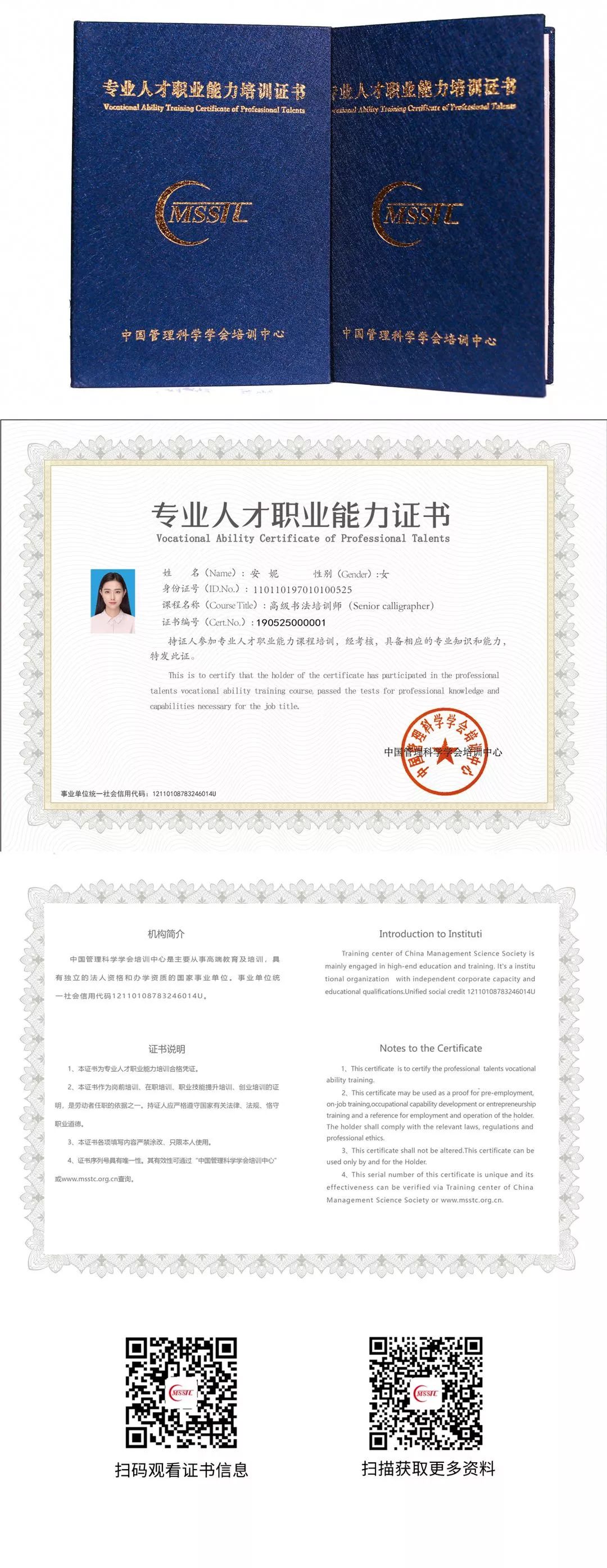 此证为样本,证书上姓名和照片本人不是“高级书法培训师”。