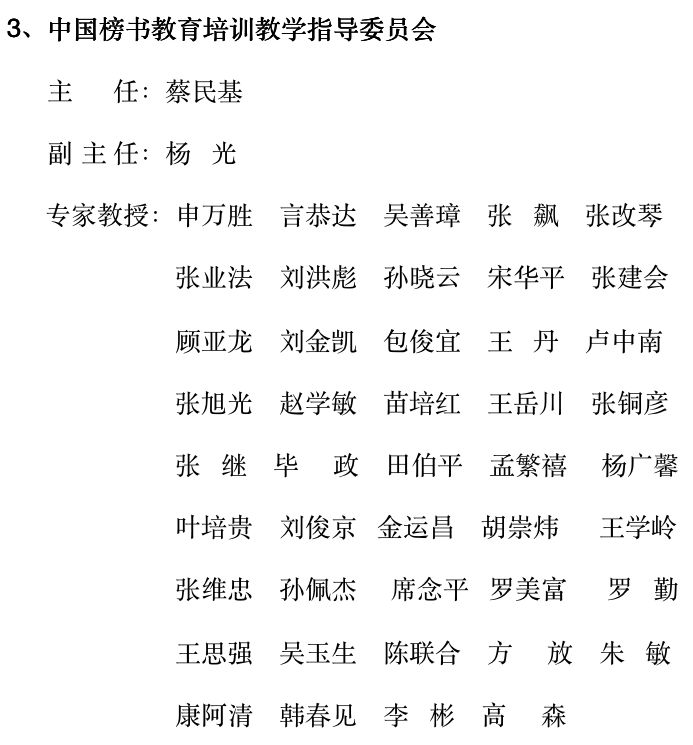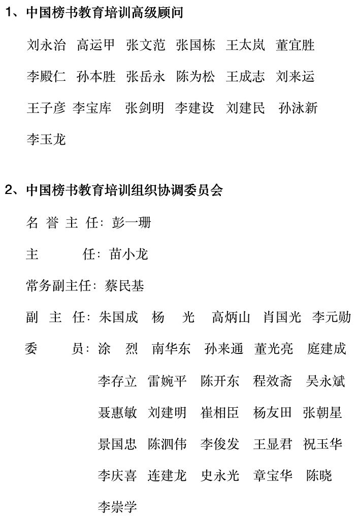 为加强对榜书教育工作的组织领导和技术指导,特聘请多位高级顾问,成立“中国榜书教育培训组织协调委员会”和“中国榜书教育培训教学指导委员会”。