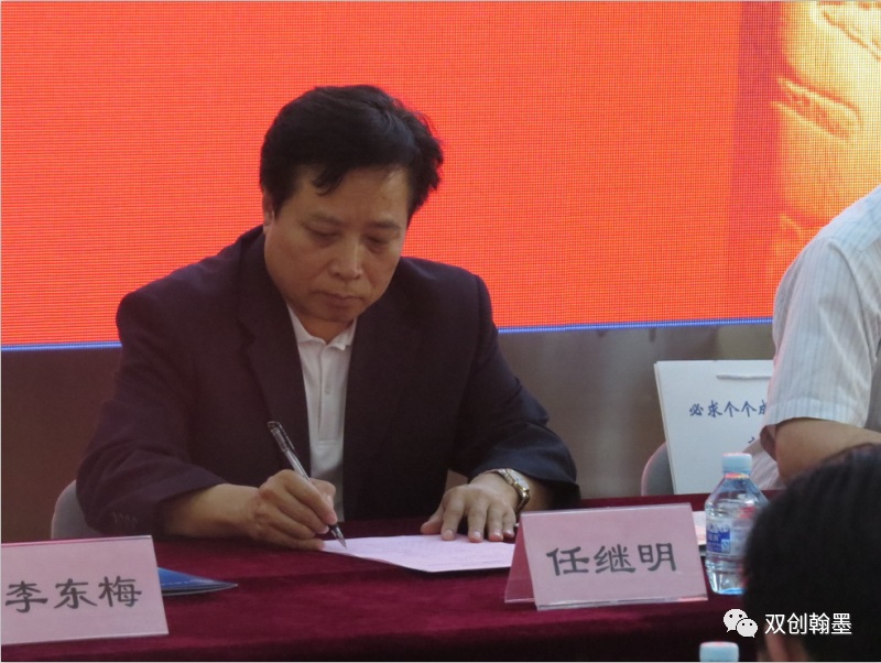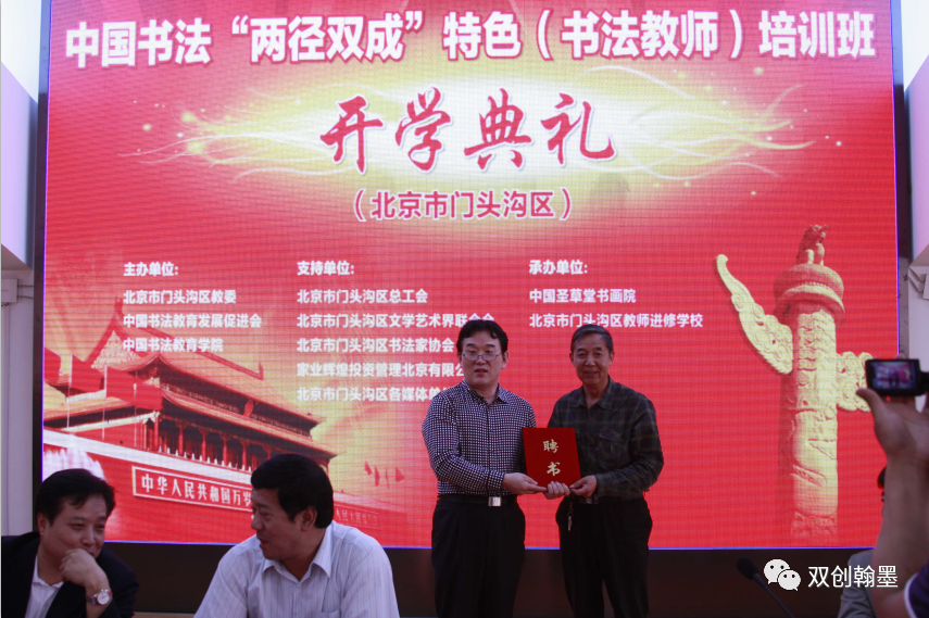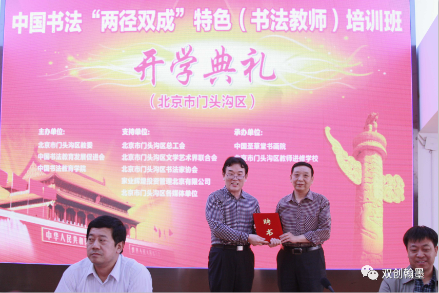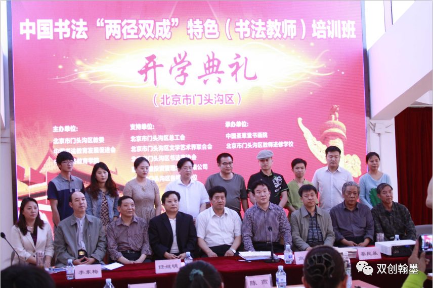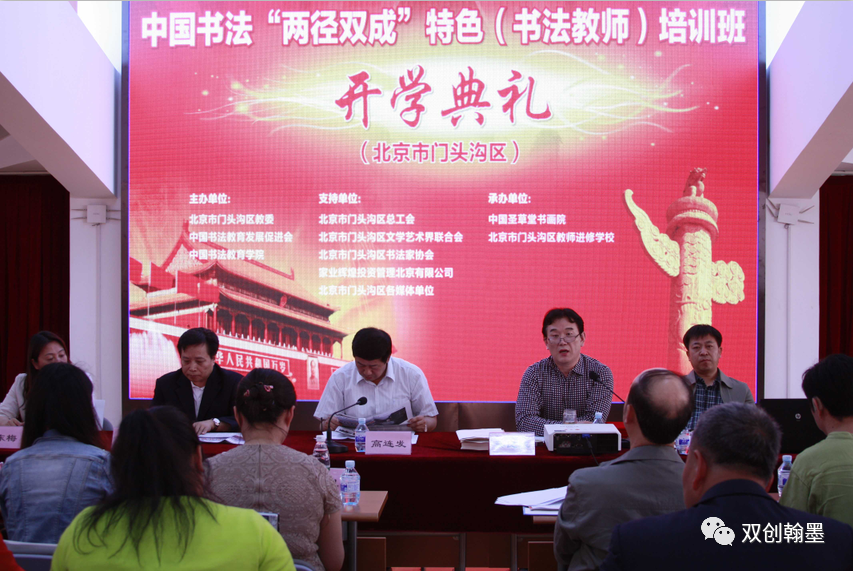 仪式上,区教委副主任李东梅女士首先热情洋溢的致词。她说,今天我们以书法教育为缘,聚在一起,开展门头沟区特色书法培训活动,共同推动区域书法教育工作,传承中华民族优秀传统文化,意义重大,我们由衷地感到高兴。近年来,门头沟教委认真贯彻落实教育部和北京市关于在中小学加强书法教育的文件精神,高度重视书法教育工作的系统设计与整体推进,采取了一系列卓有成效的措施。为了加快提高书法教师队伍的素质能力,我们今天有幸邀请到了中国书法家协会会员、北京书协理事、著名书法家蔡民基先生为我们的书法教师、书法爱好者们进行一期具有系统化、针对性的书法教育专业培训。蔡民基老师有多年的书法实践与书法教育经验,在遵循书法教学规律、坚持书法教学原则的前提下,探索创建了中国书法“两径双成”新型书法教育体系和模式,可为广大书法专兼职教师、书法爱好者“快速入门、快速成才”提供实实在在的帮助。