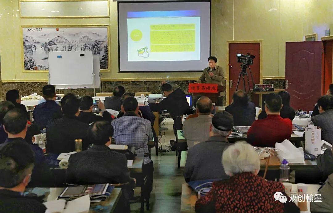 陈晓老师用数学方法对书法的研究进入跨跃式发展阶段,将五种书体用黄金分割定律进行提炼完成总结性的突破。秉书家传承应遵循以文字书写之美,为中华民族伟大复兴之必然。引一代书家巨匠启功结字的黄金分割线,让人耳目一新,并切实从人脸、人体审美比例说明,以图文演示左中右以鼻为中心的黃金分割比例0.618之美,以上身短下身长肚脐以上为黄金分割比例进步分析说明,以及蝴蝶定律的对称性原理审美,黄金三角形和两个组合一起的菱形的分割,梯型组合图的黄金分割形,对称结构中存在的文化内涵。生动的将动态的书写文字定格在静态的几何解析图形之中认识其文字之美,且表现力丰富,上下合体字结构,左右结构等黄金分割剖析,以及,对楷书隶书篆书草书四种书体皆有黄金分割,演示蝴蝶定律为对称型,其它为不对称型。并特别指出章草笔画之间的变化富有连代作用,总结为一个字”变”。为深入理解篆书引用经典举例说明,元吾丘衍《学古篇三十五举》七举曰:“法扁者最好渭之蜾扁,徐铉谓非老手莫能到,石鼓文是也。”十举日:“小篆俗皆喜长,然不可太长,长无法,以方楷一字半为度,一字为正体,半字为垂脚,岂不美哉。脚不过三,有无可奈何者,当以正脚为主,余略收短,如幡脚可也。有下无脚字,神气敦朴,可以助人。”这样引文以古释古,真可谓神气敦朴可助人。说明其学篆必博古、识器,画不能直,若背则字势不活也。进而讲金文大篆按黄金分割写,以字而示其黄金分割,从介绍元代到近代皆是写匾,正好匾到黄金分割线,以字的结构线位、线质、线速等变化产生无限思维空间,用八个字总结:”粘、穿、搭、跳、错、摆、纵、横”等,从相连、相交、相切、相接等示范介绍,在启功先生黄金分割线基础上延伸、拓展、细化,并突出“以右文化,以右为主”,体现中国文化内涵的研究理论根据已批准为发明专利,试行将文字艺术科学地落到实处。特别地推崇柳公权之心正则字正,主张要把写字和做人联系起来,品相淳朴字里行间皆自然,蕴藏着和谐与变化的哲学,是文化书法的至高境界。又诚恳地列举格式塔现象,主体对彖单一看与对比看形成的视觉认知落差,这样把有形有象的文字用黄金比例进行抽象地数字分割,完全是存在颠覆性的认知。不由得自觉让人产生文字即书法是艺术体系和科学体系两个层面,抽象与形象的中国阳阳文化结合,率先为书体艺术的整体观全面性思维模式开了先河。若文字学亦或书法学的生成,是否会以新生派系独立存在。书法学是否能成为承担起为往圣继绝学的书法传承使命。陈老师还为老师们精心制作了教学课件可谓为师的细致入微,正如他特别欢喜地善书愿施与人乐而后自得其乐的榜书字:“见微知著,知人则哲”如他的人一样,字如其人品尚高贵。格调高雅 。