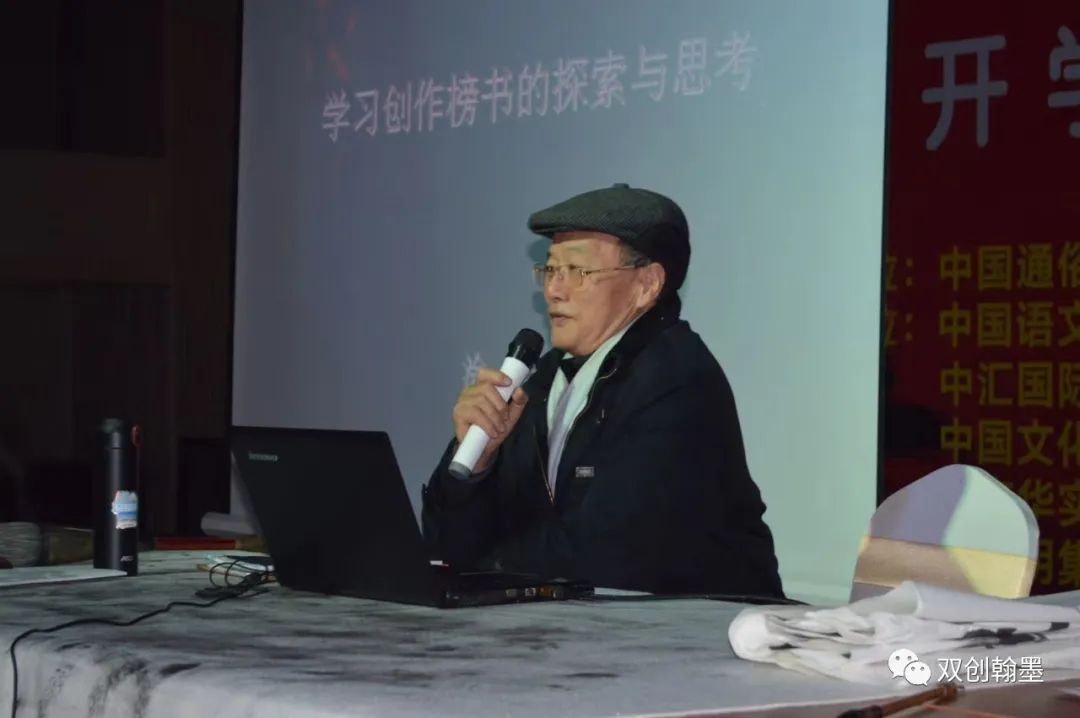 南华东老师讲关于“榜书艺术新时代发展的使命感”,提倡“传承榜书正格,宏扬榜书正气”。首先提出要认识榜书文化,榜书在当代的意义是记录历史、传承文化、壮美河山、昭示名胜的功用。指出要提升品牌形象彰显良好的社会风尚,赋于具千年历史的榜书于新的历史使命、人文内涵与价值观。集实用性、使用性、公共艺术、环境艺术的功能。提升了榜书的地位,相比之下榜书比任何书法形式更为博大精深和极具丰富内涵,榜书更能彰显大气磅礴之神韵,行云流水之灵秀,赋于其天地合一之文化蕴含,彰显审美的核心价值观。担当起灵魂深处的文化自信,以敬畏之心使榜书正本清源。以品相高雅、庄严肃穆而取法乎上。持正,引清风正气而扬榜书文化精神,荡胸中丘壑而抒榜书雄浑大气。尽其筋骨间气韵流动,出奇制胜地神采飞扬、力过千钧地章法灵动,令线条舒展、昂首无外之感,以气的运动蕴育生机,给予力量的启迪。借鉴运用法在掌指,以肩肘腕,其变化规律与实践过程,探索研究进行突破,如若执笔不同、握管不同因力之变化而异,观其气势的壮美。方寸之间的山水,观其包容之心、敬畏之心、文之美、字之美、人之美尽显其中,以美为美,美美与共。书卷之气、神采、灵性、悟性蕴含其中,运化、变化、意韵之境界,海纳百川集自然之美、博采众长为之正道,进一步阐明写好榜书主要是审美,和谐之美行之为范;文化底蕴高才勇哲;阳阳平衡足见其用。榜书者,榜样之书,行为示范,彰显精气神。