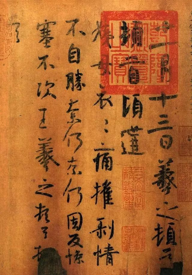 《万岁通天帖》丨又称《王氏一门法书》。唐代钩填本王羲之一门书翰。纸本墨迹卷。《石渠宝笈》载:卷高八寸三分,横七尺八寸八分。 共十帖: 一、《姨母帖》王羲之书,行书; 二、《初月帖》王羲之书,草书; 三、《疖肿帖》王荟书,草书; 四、《翁尊体帖》草书; 五、《新月帖》王徽之书,行书; 六、《廿九日帖》王献之书,行书; 七、《王琰牒》王僧虔书,行书; 八、《卿栢酒帖》王慈书,草书; 九、《汝比帖》草书; 十、《喉痛帖》王志书,草书。