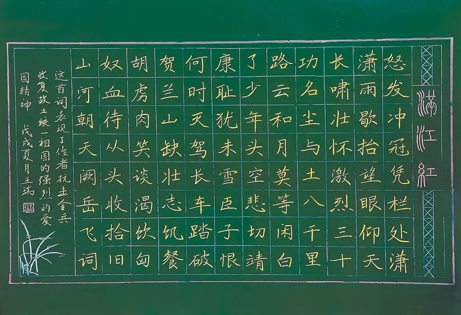 粉笔字是方块字,但字的方正不是绝对的,而是整体感觉。大部分字只是某些笔画的起笔或收笔端点处于方块之边缘(极少部分略超出),而其他地方都在方块之内。在练习过程中应首先形成“字为方形”的认识,然后注意恰当地表现字的整体方的感觉:方块边缘的笔画及相交于方块边缘的笔画定好位,不靠边的笔画写到位。