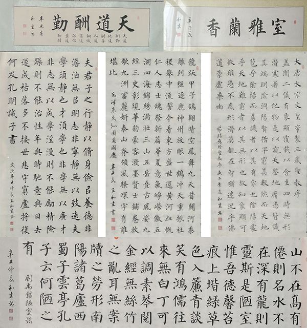 不论春夏秋冬,他每天都坚持勤学苦练,在废旧报纸上练字,然后贴在屋子的四壁,一个字一个字的揣摩学习,笔画、结构、章法。写满了揭下来,再写再贴满,他自己的屋子就是书法的海洋、任由他徜徉。