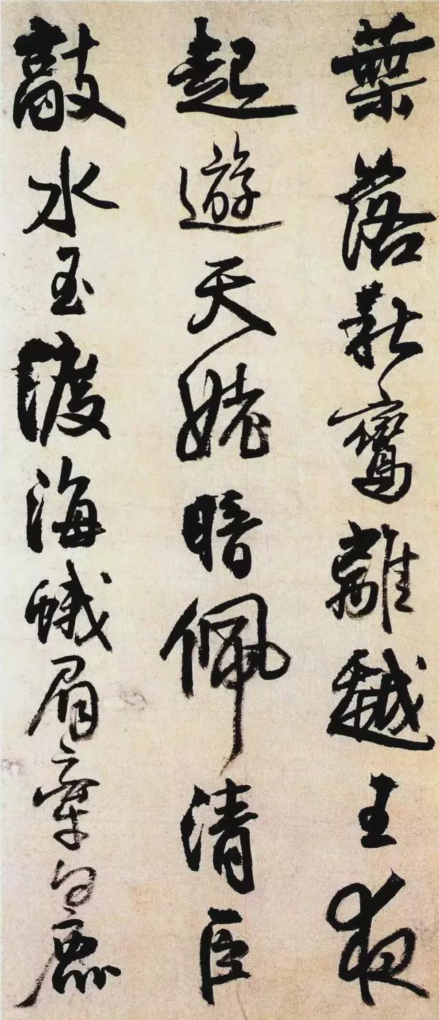 王铎确实有“独宗羲献”的作品,而这件不是,其欹侧之势出自李北海,迅疾出自米芾,而浑厚明显是法颜真卿。在这件作品中,王铎使用大量的湿墨,造成笔痕涨出,形成块面,与清爽迅疾的笔法形成对比。书法充满激情,连绵不断,气势贯通。