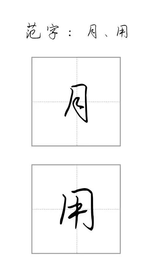 竖撇要注意从什么地方开始改变行笔角度。注意观察在田字格上的范字,借助辅助线观察竖撇的长度、改变行笔方向的位置和“撇”的角度。
