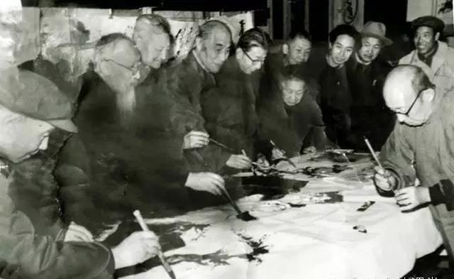 这是一张老照片(邵焱摄),据称曾发表于1986年11月的《人民政协报》。照片记录了上个世纪80年代老画家们笔会合作的场面,其中出现的7个执笔动作,细加观察,约有二人为单勾法(三指),有二人为双钩法(三指),其余三人是双钩法或五指执笔(四指双钩)难以确定。虽然画家作画要比书家写字的执笔随意一些,但也能说明其时执笔方法并不统一。
