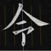 整体来看横轻竖重,笔画①和②③之间有明显的粗细对比,字内多个横画起笔形态及粗细形状各有区别,字内的变化可以说是丰富饱满。