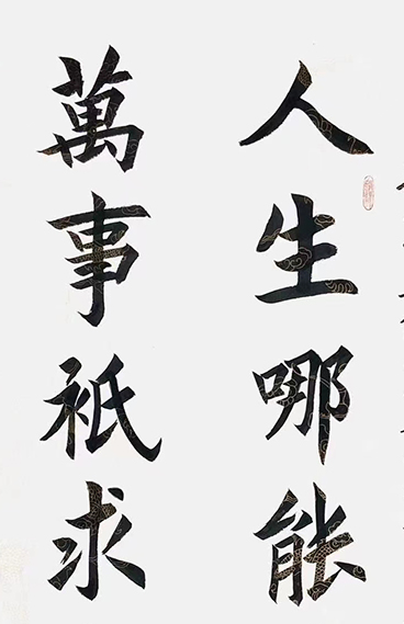 王老师的字,是成年累月的积累,是岁月的象征。一笔笔铿锵有力,笔走龙蛇,气势磅礴又不失婉转动人。它墨色流畅,意蕴清远。
