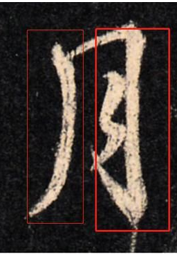 再来看这个“月”字,右边为欧阳询所写,当然欧阳询处理这个“月”字有很多种手法,这只是其中的一种,具体可以看专栏。左边是王羲之所写,同样是改变了左右的比例,形成了左轻右重的结构。