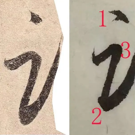 示范中的方法和方向与原帖差别比较大,更多的是加入了作者自己的行笔特点。当然他写的也不能说是错,我们只是比较原帖,来识别他的近似度而已。