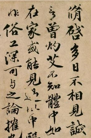 3、相交式。书法意象通过“穿插”和“缠绕”可以塑造第三种“意象”,这就是相交式。书法家往往借线条的穿插增加顾盼的情趣,体现揖、让的礼仪,王羲之《丧乱帖》“酷甚”二字的穿插,错落有致,王徇《伯远帖》单字在行间摆动,与下一行穿插,更显出左右相得的趣味。书法线条的缠绕可以造成一泻而下的“意象”。王献之《中秋帖》“中秋不复不得”等多字连写,米芾《张季明帖》中“气力复何如也”六字连书,势如长江大河,滚滚而下,表现了一种崇高的“境界”。