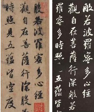 我们拿董其昌的作品来做比较,左边是赵孟頫的心经,右边是明代书法家董其昌的心经。抛开具体的技法,我们能够在比较中感受到书写节奏的不同和内在的心态差异。