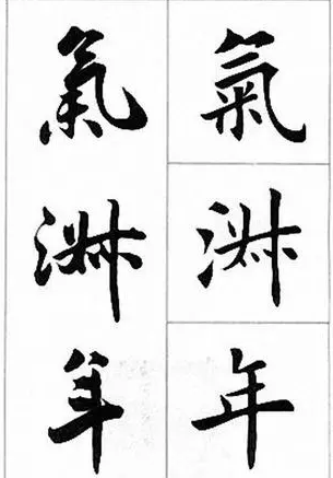 那么,如何相对"科学地"将楷书转换到行书?基本原则是大道理,从宏观上指导人们的思维和实践,具体方法是明细要求,从微观上规范人们的日常行为。书法实践不能光讲大道理,要有具体要求来规范操作过程。"变"是楷书向行书转化的关键。下面用实例来做印证说明。