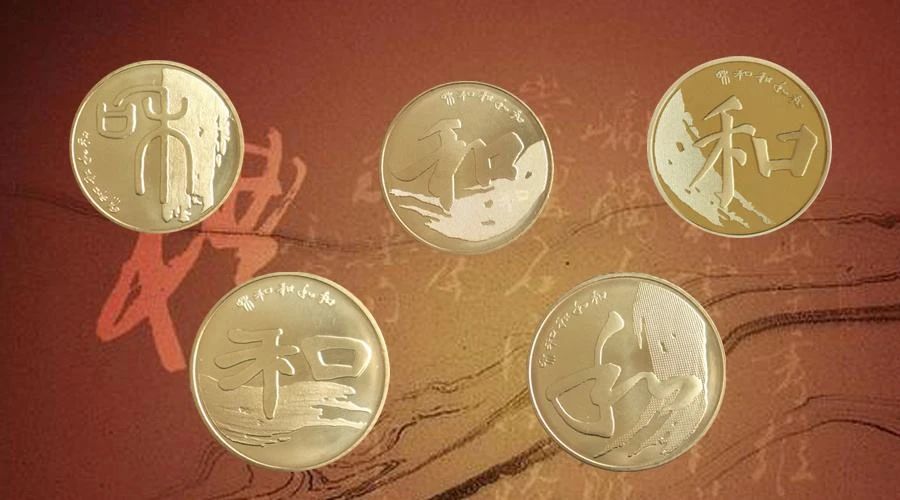 《会稽刻石》里有这么几句:皆遵轨度,和安敦勉,莫不顺令。纪念币上的篆书“和”字就是从这来的。