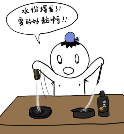 倒出来的墨汁随着时间积累,水分也会随之挥发。久而久之新鲜的墨汁就会逐渐变为“宿墨”(隔夜墨)。而墨汁中经过水墨分离后剩下的胶量明显会比“新墨”占比更多,因此书写时候墨汁除了更显迟涩外,墨色也会显得更加乌黑。