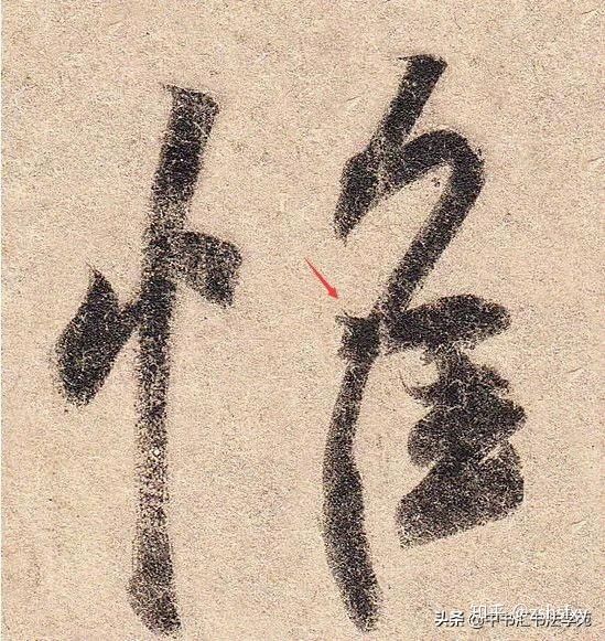 王羲之《丧乱帖》中“追”与“即”字,红色箭头为半虚半实,似接似断,黑色箭头为实接,一笔在另外一笔的内部起笔。