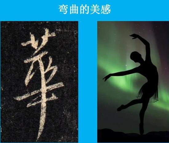 这种弯曲的写法使得此字活了起来。就像右边曼妙的舞女,有了动感。