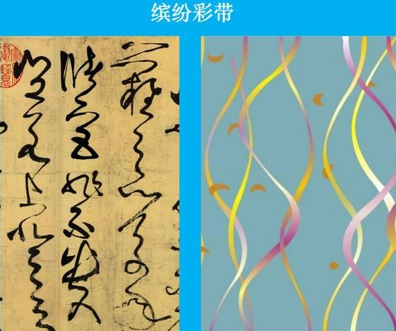 左边是张旭的《古诗四帖》,我们选取其中一部分来进行移情赏析,图中的连绵不断的笔势和连贯的行气就如同右边的彩带一样眼花缭乱、目不暇接。