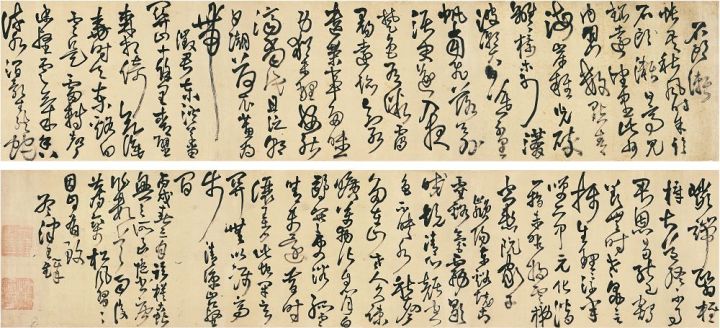 和整齐内敛的篆隶楷相比,行草线条更为丰富,大小、方圆、浓淡、枯湿、长短、欹正等对比更为强烈,很容易吸引观众的兴趣。因此,很多展览中的行草书数量远远超过了其他书体,大块的墨团、夸张的线条、扭曲的字形等等也都在不知不觉中粉墨登场,远远望去,颇有些“群魔乱舞”的感觉。为了不得罪人,咱们再看一幅王铎,看看人家是怎么处理笔墨关系的,再回忆一下展览上的作品,是非曲直大家自行对比就能明白了。呵呵。