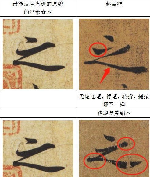 但是赵孟頫、褚遂良、虞世南这几位大家的临摹本都与冯承素本皆不一样,他们临摹的字还与冯承素本有较大差别