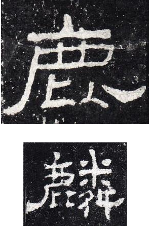 下面是《礼器碑》和《史晨碑》的鹿字,如果观察够仔细的化,会发现一个奇怪的地方,就是“广”的上下两部分是分开的,不是我们今天的写法。