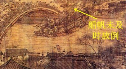 第二个例子,画的中间有一个非常的经典的冲突,那就是桥下的船,由于船夫没有及时将船帆拉下来,致使船无法过桥,因此船需急停,从而导致这种手忙脚乱的场景。这一紧张的气氛就是场景冲突。