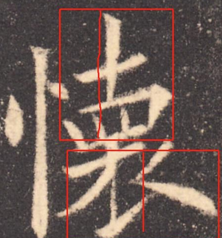 比如这个“怀”字,右边的上下结构在处理的时候同样采取了这样的错位,用笔法将上部分的重心偏移,然后通过下半部分的重心偏侧来平险。这也是为什么欧楷被称为险绝的原因!