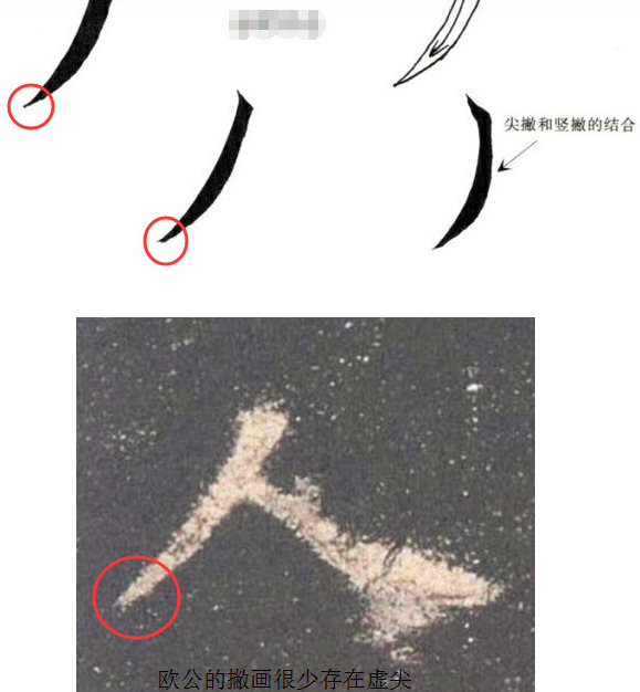 就撇笔来说,田字比欧字明显灵动飘逸,欧字比较沉稳,当然这可能也有碑拓和原迹本身的差异存在。从现代审美看,田字的撇更美观。但田字多见过度的虚尖,我的理解可能这是一种习惯或随意性,因为毫无疑问田完全有能力不写出那样的虚尖。5.捺笔捺笔的差异,大体上仍然是田字将捺笔标准化了。田字标准捺笔出刀是“下沿”斜向右上方,“上沿”斜向右下方,刀锋的走向意思取平出,笔锋最后有个小小的下压动作。田字几乎全部如此,欧公则是大体如此,亦时有例外。