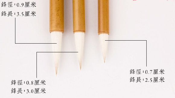 以写楷书为例,按大小尺寸及用途分的话,我们大致可以分为这几种:小楷、中楷、大楷、对联及榜书牌匾所用的毛笔,毛笔的大小和尺寸主要看的是毛笔笔头的出锋长短(锋长)和锋径。