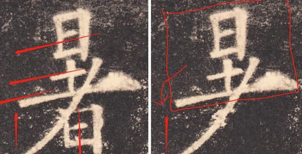这个“暑”字写的比较大胆,上面的“日”与“土”字整体是一个左下倾倒的势态,重心在左下,而欧阳询为了平衡这一个左移的重心,用一个有力的,穿过上半部分,并将其成功托住,而此时欧阳询为了平衡一个整体的重心,将一个不大不小的“日”字底粘合在了长撇之上,一是平衡了整个字的重心,而是打破了一个长撇长掠的势态。