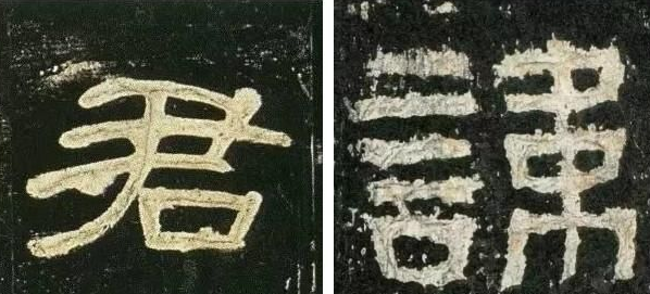 《曹全碑》中的“君”字,以圆笔为主,蚕头燕尾。而《张迁碑》中的用笔乃是以方笔波磔为主,此锋变之故也。