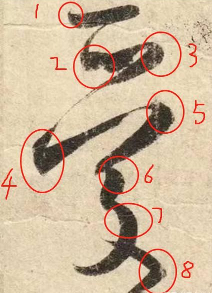 我们看王羲之尺牍中这个字,其变化丰富,令人叹为观止。1处起笔,乃是空中运笔,一搨直下,绞锋行笔,第一笔折锋收笔,提笔转锋平出,调制中锋,至3处绞转换锋,至4处折笔再次换锋,然后以中锋提、按至5处再次绞转换锋,6、7、8处一样的绞转换锋,一个字出现了十多次的提按变化,以及锋面的换锋动作,其变化可谓极矣。