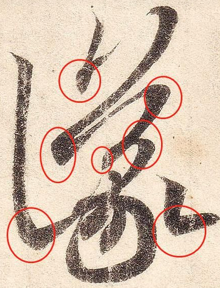 我们再图中用红色圆圈标记的就是转折的部分,王羲之用笔如神,除了提按变化、字法变化还有这种方圆的变化,方圆的变化指的就是转折的技巧。