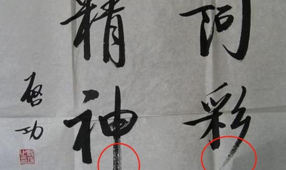 这一点说难不难,说简单也不简单,其实就是用墨的技巧。用墨其实就是“虚”与“实”两个方面。“虚”就是笔画淡一些,乃至出现飞白。“实”就是墨色浓一些,乃至出现“墨猪”。