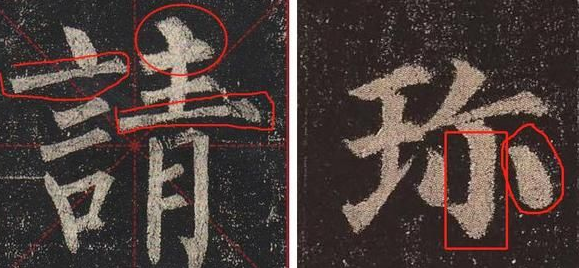 我们看这个图,左边是柳公权的字,右边是颜真卿的字,这个“请”字在笔画比较细的地方我们看,没有丝毫的纤弱,反倒是力量更足,这就是柳体字的“骨力”,就是因为中锋行笔所至。