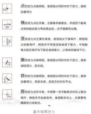 下图为各个基本笔画的手指、手腕发力,学习时需灵活掌握,不可用蛮力。