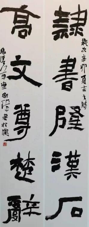 第二,优化了汉隶风格,体现了时代意义。传统的隶书作品,除了《石门颂》及相关的碑碣摩崖具有飘逸恣肆等特点外,大都是风格静穆,雄浑烂漫,很有静态书法的主体特征,而这幅作品,在创作中对传统汉隶进行了风格优化,变静为动,变沉为活,给隶书赋予了灵动巧妙的时代意义,不失为一件佳作。