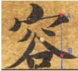 但更好的方法是观察笔画之间的相对位置,尤其是与上一笔的承接关系,而不是孤立地对应坐标。我们可以明显的看到,欧阳询在处理这个字的时候,戈钩的起笔位置正好在上一笔折钩钩角(B点)的正上方处。然后我们对比九成宫中有所的成字,发现尽管戈钩长度不完全一样、弧度也不完全一样,但是却都有AB点对应关系。再对比一些其他书家的结构特征,发现王羲之、钟繇等尽管字形迥异,但同样存在这样的规律: (钟繇荐季直表)