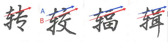 我所标注的A线是非常重要的参考线。例如:较、辐、辑,A线确定了右部第一笔的起笔位置,而他们的共同特征是右部起笔是横向笔画。即:在车这个偏旁当中,右部的横向笔画起笔位置定位在A线上。为什么“转”字是特例?因为转的右部是纵向笔画。