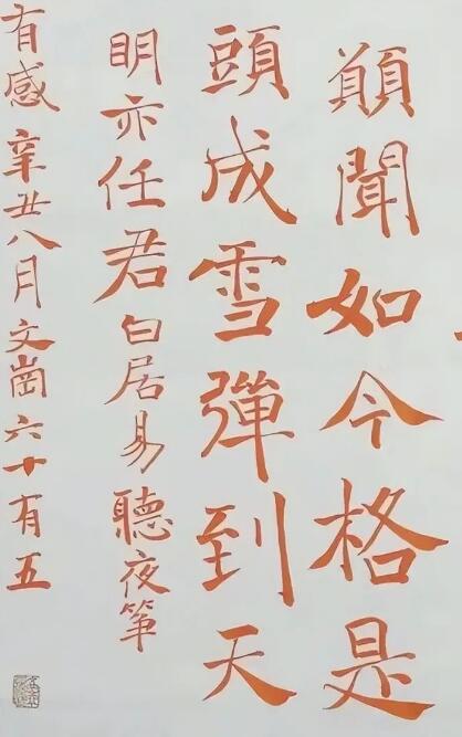 我们从他的楷书作品中可以看出,这些楷书作品虽然笔法没问题,但仅从字形上来看,变形、夸张、拉伸、压缩等各种手法均有,而从整体上来看,却有了书法的“味道”,看起来,尤其是看得时间越长,越感到意味深厚。