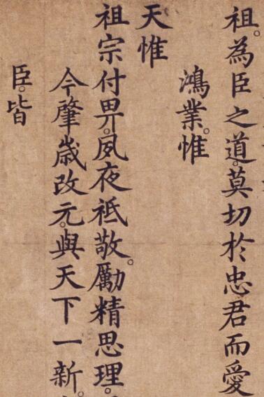 释文:勅谕文武群臣夏原吉等。皇帝勅谕文武群臣,朕惟君国莫大于奉天守成,莫重于法祖。为臣之道,莫切于忠君而爱人。朕嗣承鸿业,惟天惟祖宗付畀,夙夜祗敬,励精思理,不敢怠宁。今肇岁改元,与天下一新,尔文武群臣,皆祖宗所简任,以遗朕者,其必有以副朕之望,据诚秉义,茂乃嘉猷,以辅予德。殚厥智虑,勤力不懈,以共乃职,尔惟懋哉。治民者悉心爱民,治军者悉心爱军。俾咸享乐利用,副朕子惠群生之意,尔惟懋哉。端乃心,慎乃行,务忠厚而戒刻薄,务正直而戒邪枉,毋附下而罔上,毋肆已以虐人,毋作聪明乱旧章,毋黩货利坏名节。