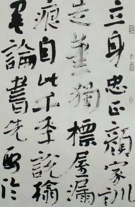 第一,创作均以颜体为底子,创作自己的楷书作品。早在2007年的全国九届书法展上,李国胜以颜体楷书创作的楷书作品获得了一等奖后,许多书法家便把目光放在了颜体楷书之上,并且对此进行了细致研究,后来,刘洪彪、张旭光等许多书法名家也用颜体楷书创作自己的楷书作品。但仔细观看后发现,这些名家的楷书作品并非是完全意义上的颜体楷书,而是以颜体的“意”来写自己的作品,这是取法于“颜”。